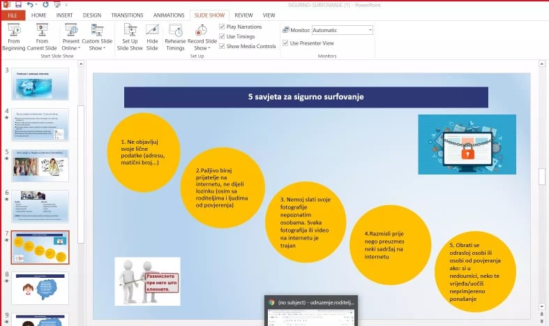 Edukativna predavanja su vodile socijalne radnice Katarina Čarapić i Tanja Ćirović iz udruženja Roditelji, kao i Sanja Gardašević i Danica Čelebić iz Digitalizuj.me i agencije Alicorn. Osnovnoškolci su imali priliku da razgovaraju o tome kako da aktiviraju postavke koje štite privatnost, zaštite se od nasilja, kako da reaguju u slučaju zloupotrebe podataka ili nasilja od strane vršnjaka ili nepoznatih osoba, a teme su bile i razlike između online i uživo nasilja i komunikacije među vršnjacima.
